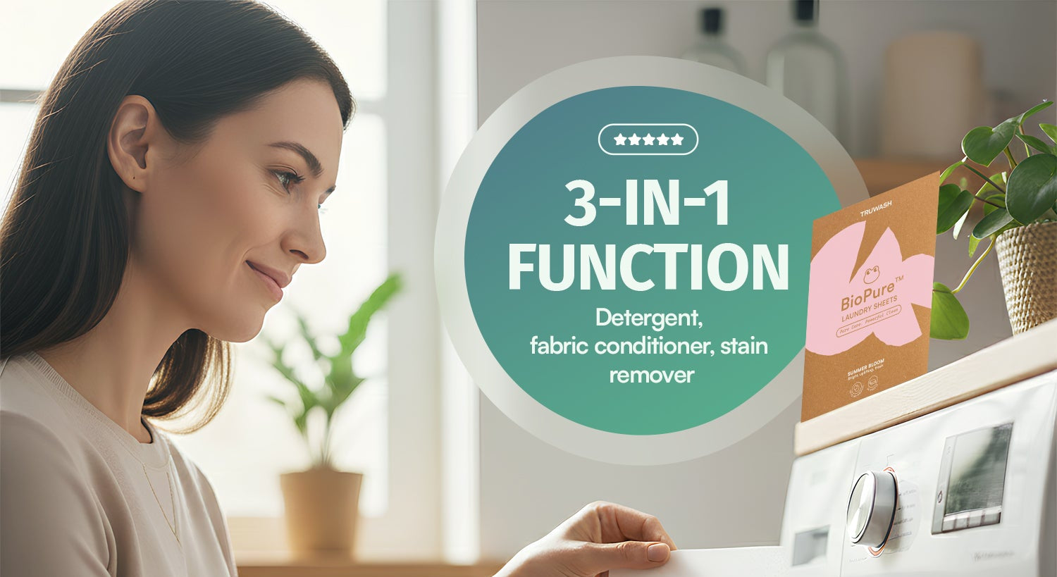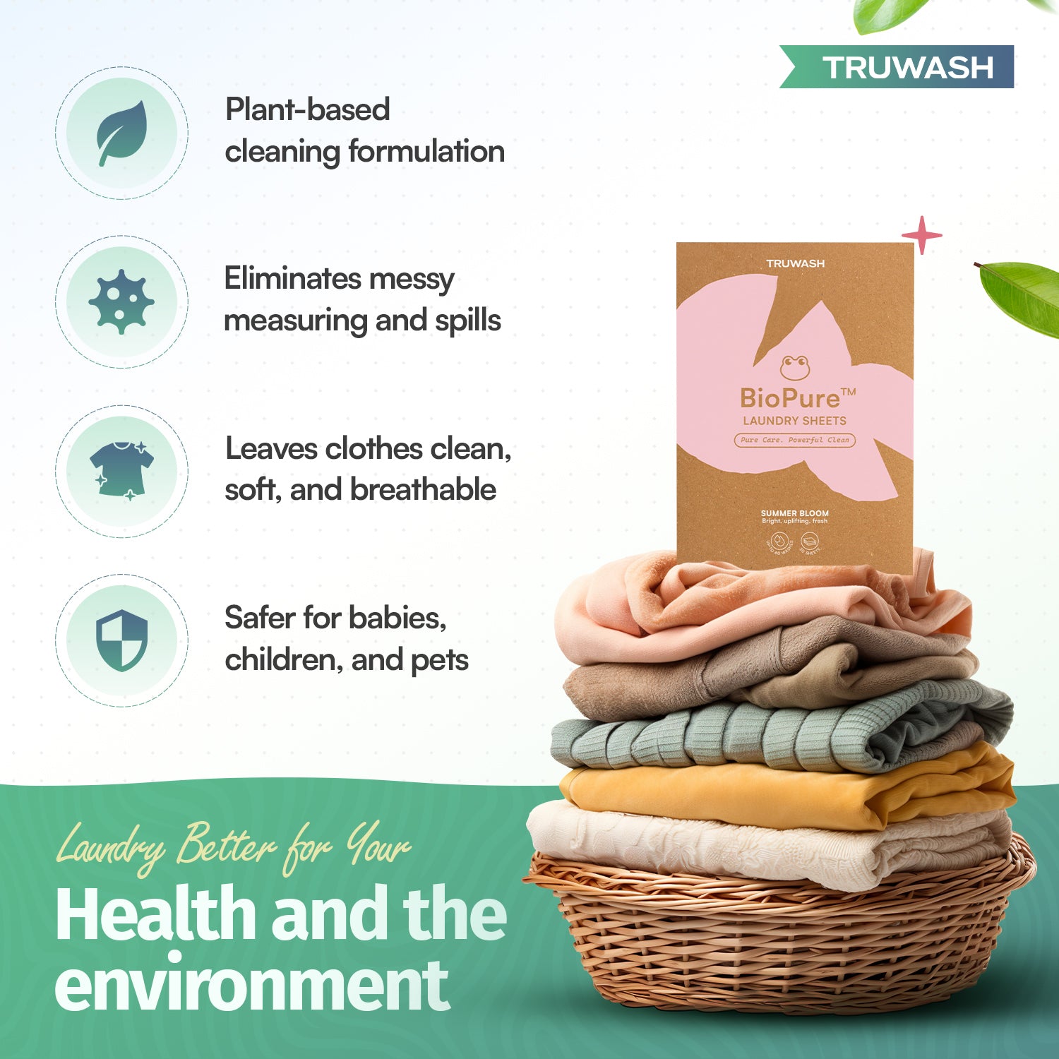 Truwash BioPure Laundry Sheets and Fabric Softener delivers a powerful, plant-based clean without the mess of liquid or powder. These easy dosage sheets are infused with biodegradable enzymes and they dissolve completely in hot or cold water, leaving clothes fresh, soft and naturally cared for.