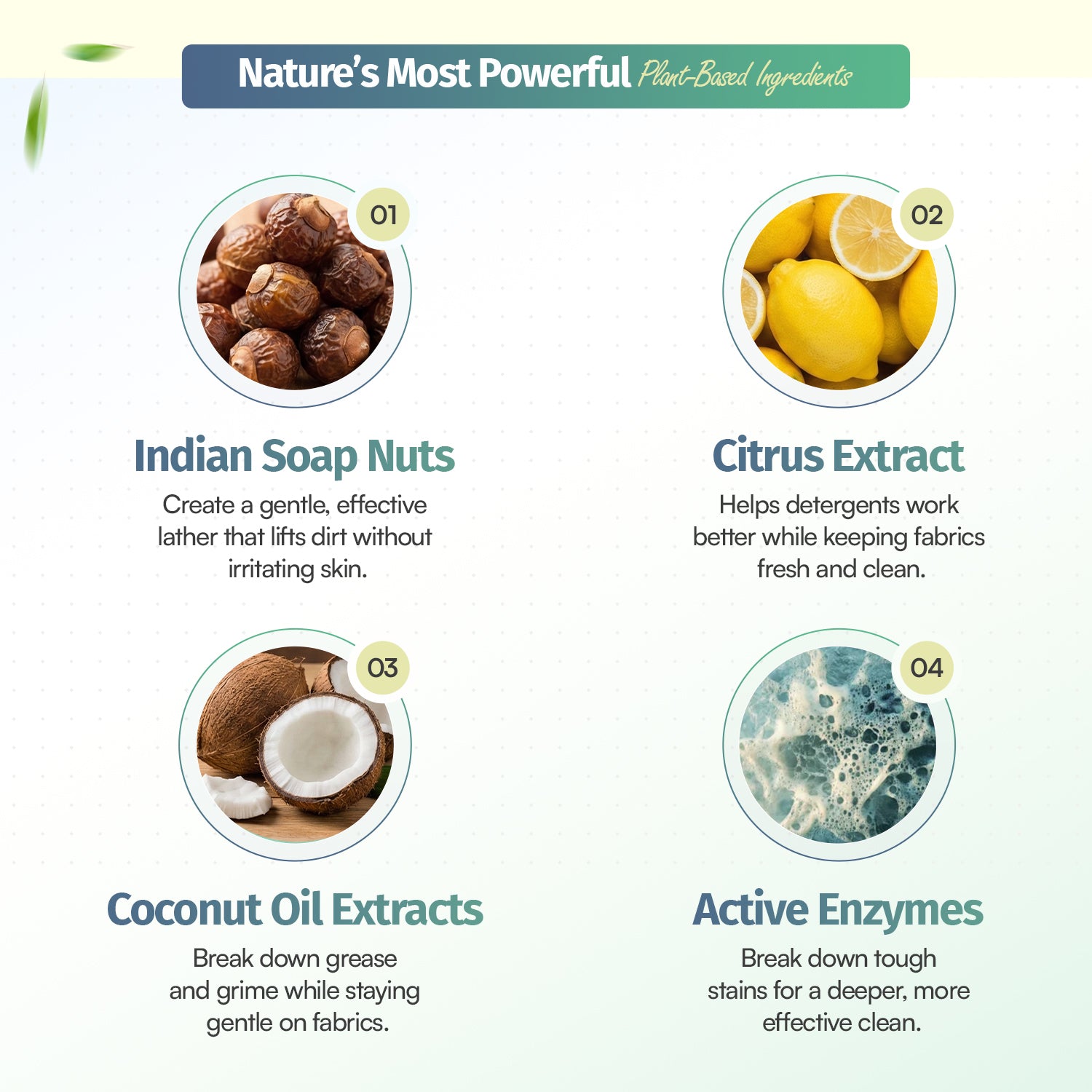 Highly concentrated, zero-waste detergent. Gentle on skin, tough on stains. Biodegradable & non toxic formula. Compact, travel-friendly sheets.