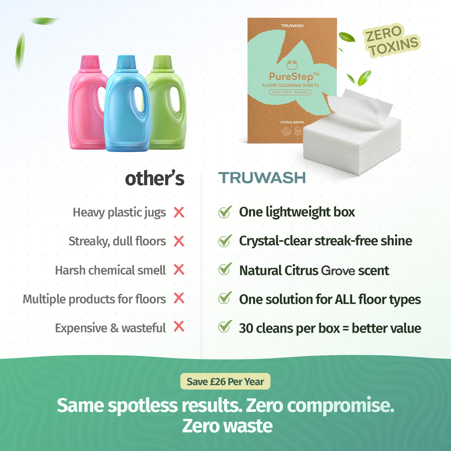 Make the switch to a safer, greener clean. PureStep Floor Cleaning Sheets deliver powerful, dual-action performance from 100% plant-based derivatives that are free from harsh chemicals, leaving your floors brilliantly clean without harsh chemicals or plastic waste.