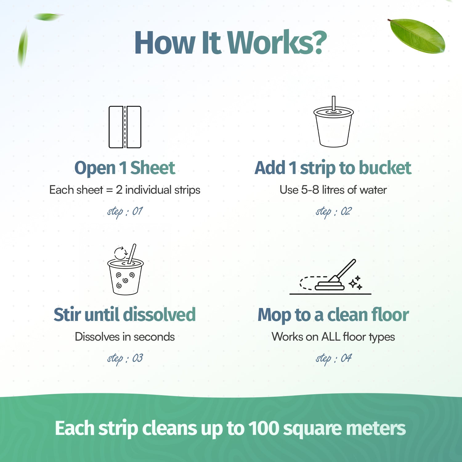 Watch built-up grime, grease, and sticky messes effortlessly disappear, leaving behind a beautiful polished shine and subtle natural plant fragrance. Our ultra-soluble sheets dissolve quickly for zero-mess mopping—just drop, clean, and enjoy. Lightweight and compact, they help you reduce plastic waste while delivering a brilliant clean that's safe for your home and family.